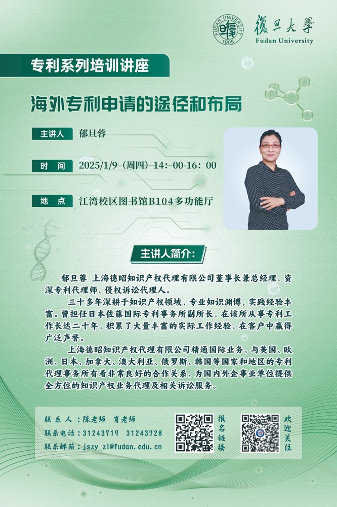 科研院技术转移中心将于与1/9(周四)14:00-16:00由主办自拍偷拍 专利系列培训讲座-海外专利申请的途径和布局,讲座地点为江湾校区图书馆B104多功能厅,请感兴趣的老师扫描海报中二维码报名。