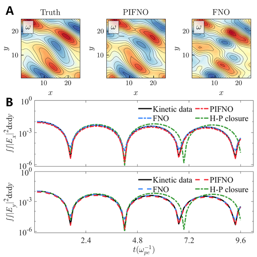 图2:A)PIFNO模型预测等离子体涡量,与动理学结果一致;(B)朗道阻尼过程对比